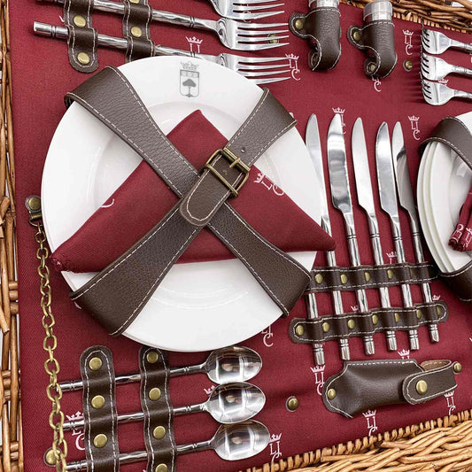 Todas nuestras cestas de picnic para 6 personas incluyen vajilla para 6 personas (platos, cubiertos, vasos, accesorios, etc.).