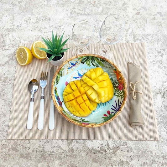 Descubra nuestra vajilla de melamina de la colección MelARTmine. Planos o hondos, sus platos redondos de melamina realzarán sus mesas de interior o exterior y deslumbrarán a sus invitados. Nuestros platos de melamina son perfectos para el día a día, ¡pero también para las ocasiones festivas! ¿Sus ventajas? Están fabricados en melamina pura, por lo que son resistentes a los golpes, ligeros, aptos para el lavavajillas y mantienen su brillo con el paso del tiempo. Elija un plato de melamina entre una gama de temas coloridos: Tucanes de Río, Jungla, Monos de Bali, Lisboa, Flores exóticas... ¡Sólo te queda vestirlo!