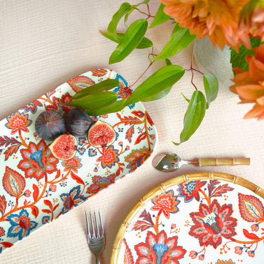 Fusiona el encanto tradicional de Jaipur con la practicidad moderna de la melamina. Resistente a los golpes y prácticamente irrompible, combina elegancia y durabilidad. Perfecta para todas las ocasiones, esta colección de vajilla de melamina incluye una amplia gama de piezas: platos de servicio, tazones, ensaladeras, bandejas, cubiertos y manteles individuales. Cada elemento está decorado con magníficas flores indias en tonos rojos y azules, creando una atmósfera exótica y refinada en tu mesa. Añade un toque de la eterna India a tus comidas con la colección Jaipur.