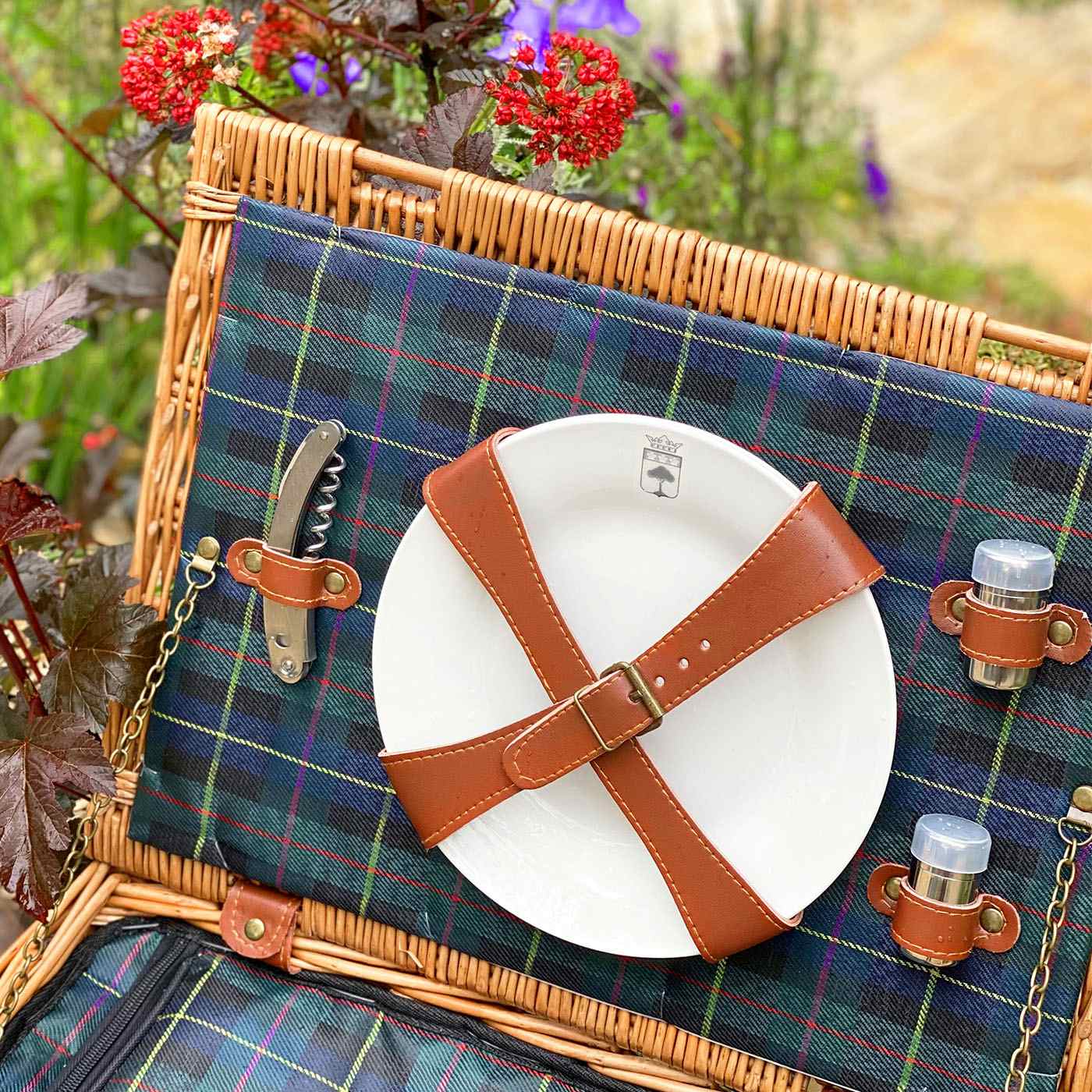Cesta picnic de cuero tejido tartán verde - 2 personas