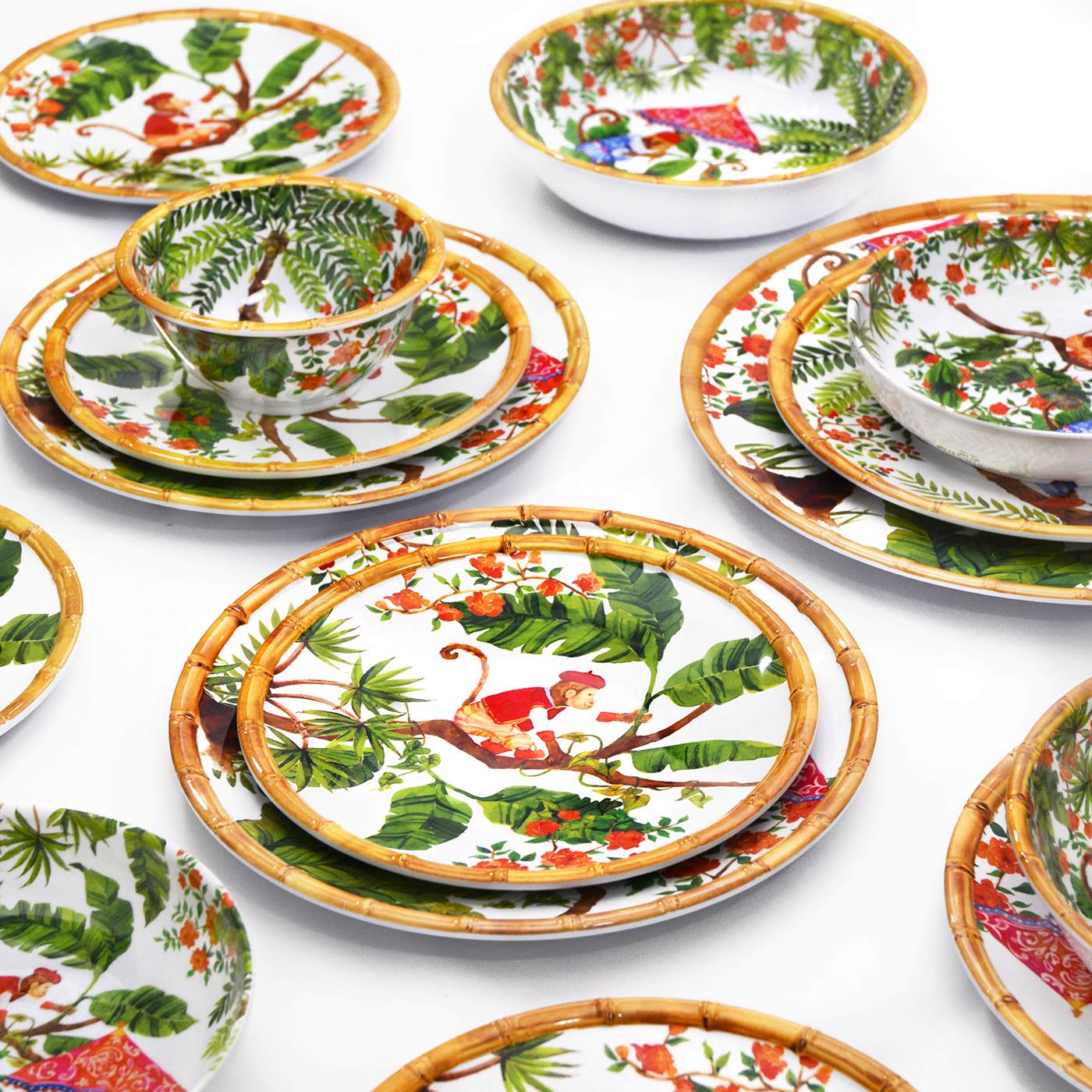 Este plato llano grande de melamina de 28 cm está decorado con bonitos motivos de monos balineses. Este plato Bali tiene un acabado de efecto bambú. ¡Un detalle que hace que está a la moda! Casi irrompible, este plato de servicio muy colorido dará un tono original a la decoración de su mesa. ¡Elija un plato tan bonito como el cerámico pero sin su fragilidad! La serie Bali incluye platos llanos grandes y pequeños, ensaladera grande, ensaladera profunda, cubiertos para ensalada, fuente larga, fuente redonda y octogonal, bandeja grande y un juego para aperitivos de tres cuencos. Toda la vajilla es lavable en el lavavajillas. Los platos pueden presentarse con un único motivo o combinarse con los platos de postre y los cuencos verdes y rojos de la colección Colores Unidos para crear mesas coloridas y originales. Para conservar la vajilla el mayor tiempo posible, es preferible no utilizar cuchillos con dientes demasiado pronunciados (por ejemplo, cuchillos para carne) para no rayar el material.