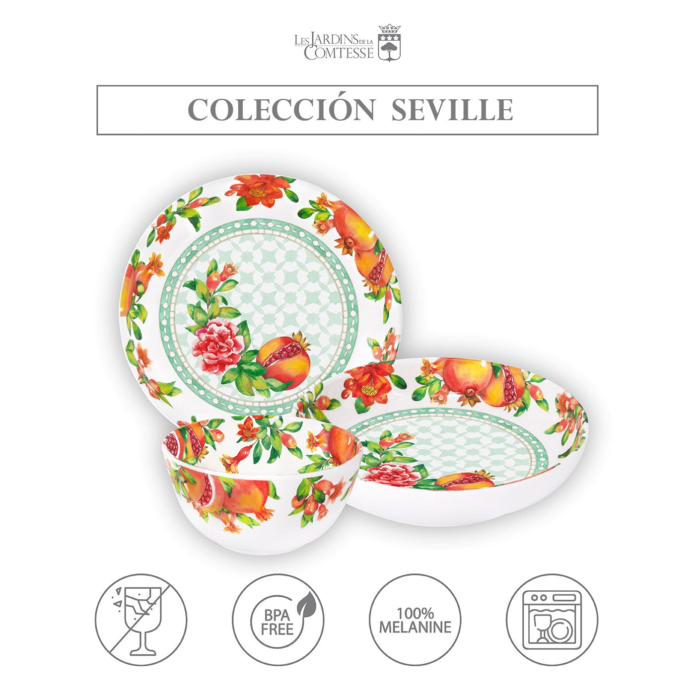 ¿Te encanta recibir a tus invitados con una mesa llena de color y acogedora? Descubre nuestra colección de vajilla de melamina Sevilla, con delicados diseños de granadas jugosas y flores coloridas sobre un mosaico verde agua, evocando los jardines más hermosos de los palacios moriscos.
